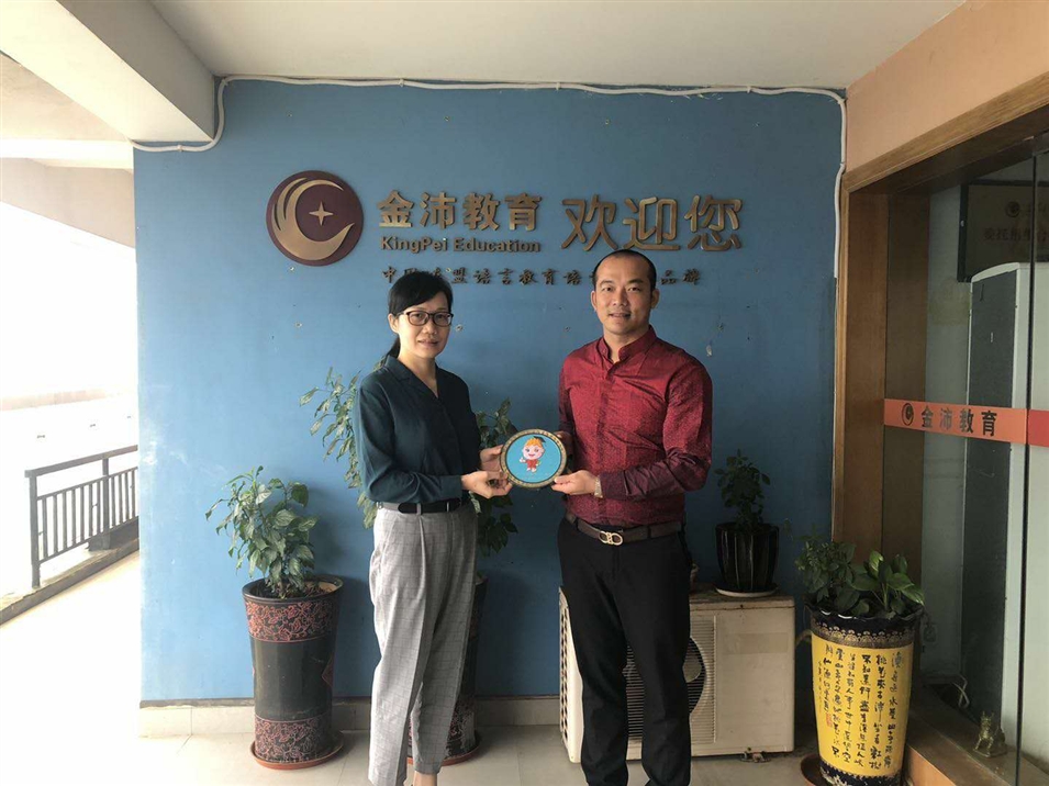 廣西金沛教育執(zhí)行董事粟宥朝右一向廣西國際文化交流中心羅副秘書長(左一)贈送吉祥物“金小沛”