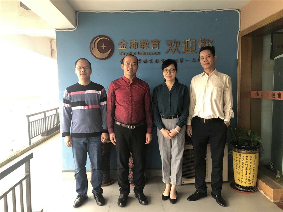 廣西金沛教育執(zhí)行董事粟宥朝左二)、國際部合伙人許顯鋒左一與廣西國際文化交流中心副秘書長羅琨(右二)、經(jīng)濟科技部部長吳偉(右一)一行合影留念