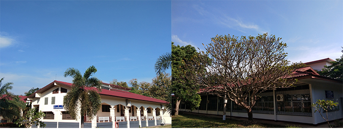 郁郁蔥蔥的東南亞特色的植被中,紅白相間的老撾語(yǔ)教學(xué)樓十分醒目,跳躍在金色陽(yáng)光下的東南亞特色建筑教室,顯得干凈整潔。