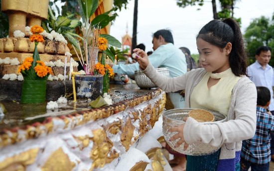 老撾人在寺院拜佛、浴佛、潑水、栓線、布施、堆沙、放生等,同時(shí)在家里、大街上相互潑水、祝福,讓純潔的水洗刷掉過去的疾病、災(zāi)禍和祈求來年雨水充沛,五谷豐登,迎接美好的新的一年。