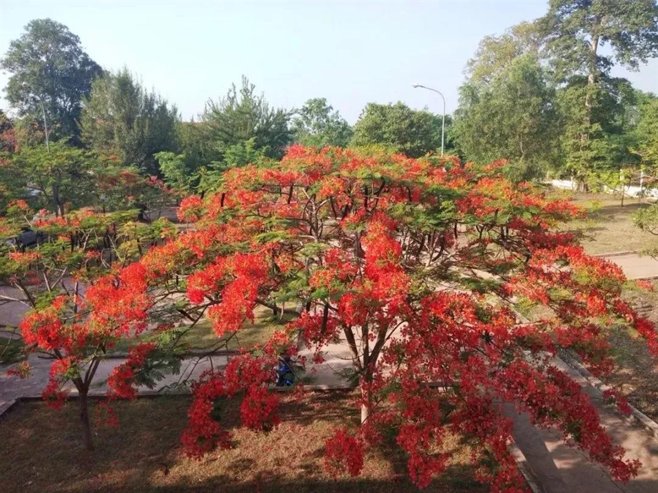 宿舍區(qū)有一片小森林,午后或者晚間,可以跟朋友一起散步,特別是炎熱的夏季,感受習(xí)習(xí)涼風(fēng),整個(gè)人神清氣爽,四月的宿舍樓下環(huán)境很迷人的,樹木長(zhǎng)滿了紅花,就像火熱的天氣,好像在宣告著:夏天來了